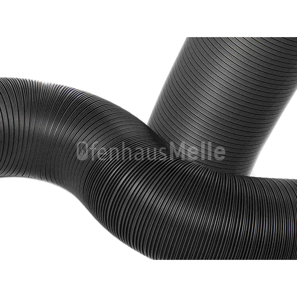 Nahezu alle Kaminöfen sind entweder grau oder schwarz lackiert. Durch die immer dichter werdende Bauweise der Gebäude werden Kaminöfen immer häufiger mit externer Verbrennungsluft versorgt. Oft werden hierzu „silber-farbige“ Aluflexrohre eingesetzt, da diese flexibel einstellbar sind. Die Verbrennungsluftführung durch ein silberfarbiges Aluflexrohr stört hierbei jedoch oft merklich den Gesamteindruck der Ofenanlage, da das silberne Rohr sehr auffällig ist. Die Verbrennungsluftführung soll möglichst unauffällig gestaltet werden und nicht „ins Auge springen“. Abhilfe schaffen hier nun die CB flexiblen Aluflexrohre in schwarzer Beschichtung. Diese hochwertig beschichteten Aluflexrohre sorgen für eine flexible und dabei trotzdem dezente Verbrennungsluftversorgung des Kaminofens.
