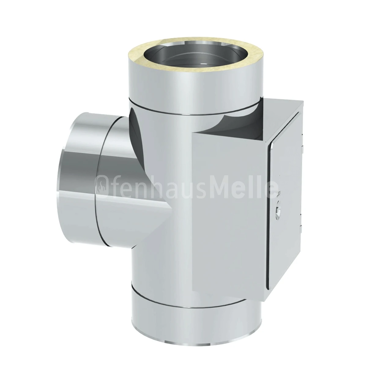 T-Anschlussstück 90° mit gegenüber liegender Reinigung für doppelwandigen Schornstein aus hochwertigem Edelstahl, mit einer Materialstärke von 0,5 mm und 25 mm Isolierung.