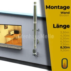 Doppelwandiger, isolierter Edelstahlschornstein mit einer Gesamtlänge von ca. 8 m, zur Wand- oder Bodenmontage.