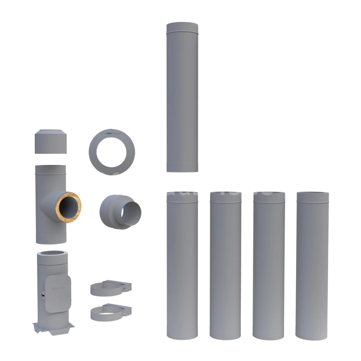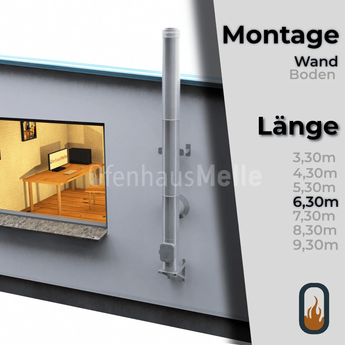 Edelstahlschornstein doppelwandig Grundbausatz DESIGN im Nenndurchmesser 130, 150, 160, 180, 200, oder 250 mm (innen) mit einer Gesamtlänge von 6,30 m.