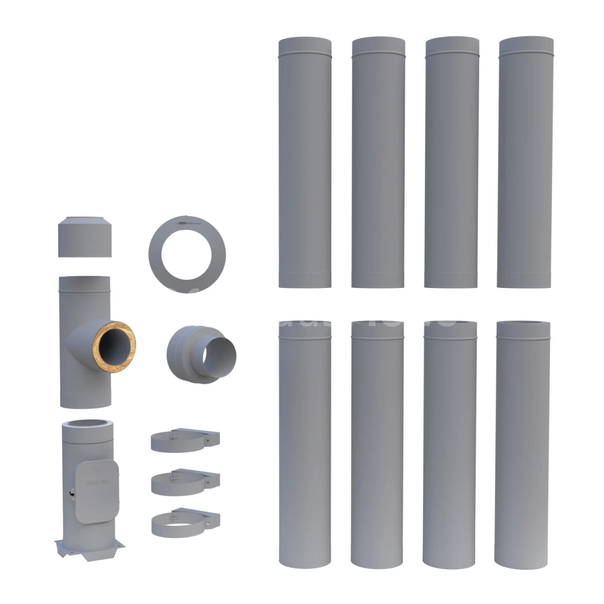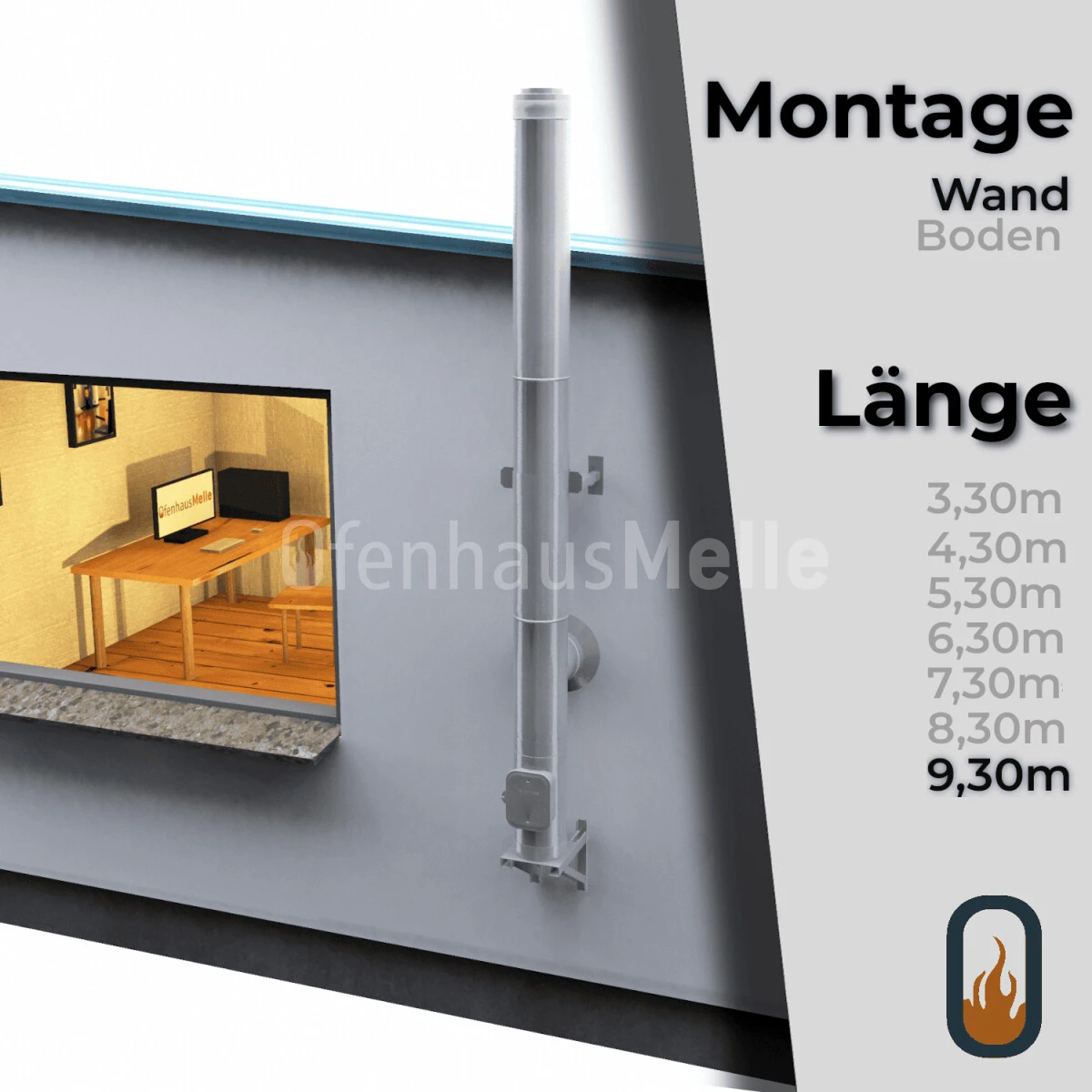 Edelstahlschornstein doppelwandig Grundbausatz DESIGN im Nenndurchmesser 130, 150, 160, 180, 200, oder 250 mm (innen) mit einer Gesamtlänge von 9,30 m.