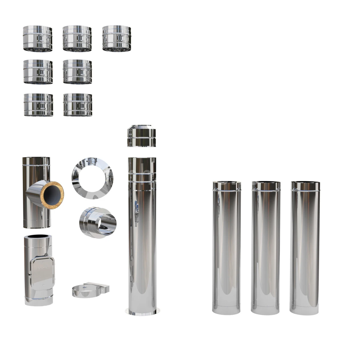 Doppelwandiger, isolierter Edelstahlschornstein mit einer Gesamtlänge von ca. 5 m, zur Wand- oder Bodenmontage.