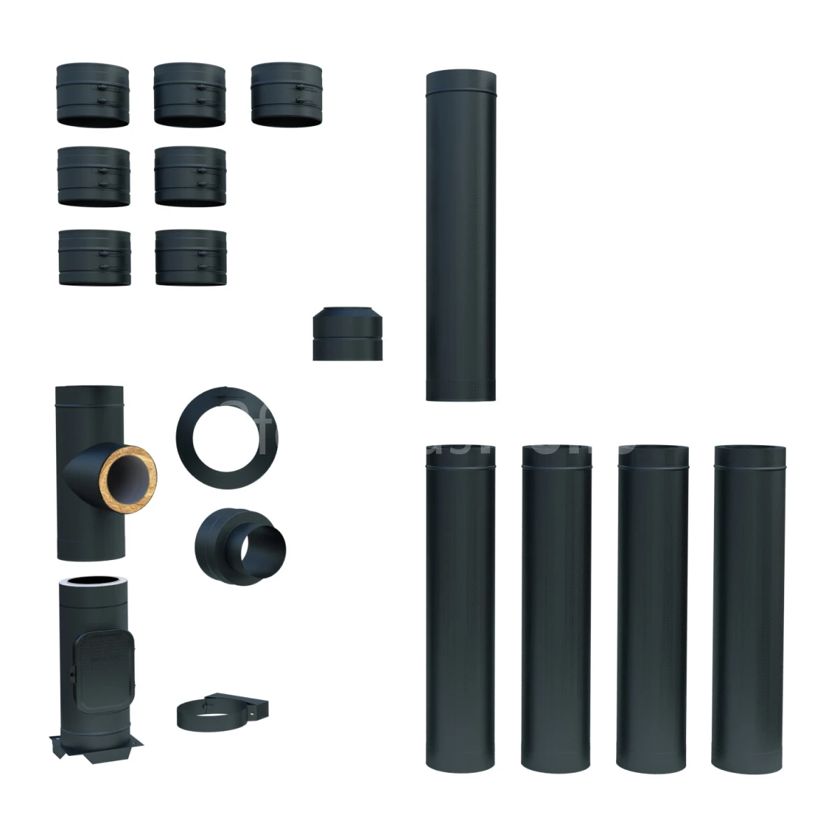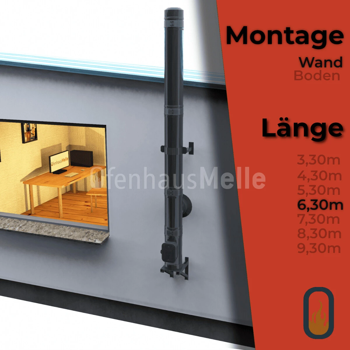 Grundbausatz Doppelwandiger Edelstahlschornstein Pulverbeschichtet mit RAL-Farbe nach Wahl im Nenndurchmesser 130, 150, 160, 180, 200, 250 oder 300 mm (innen) mit einer Gesamtlänge von 6,30 m.