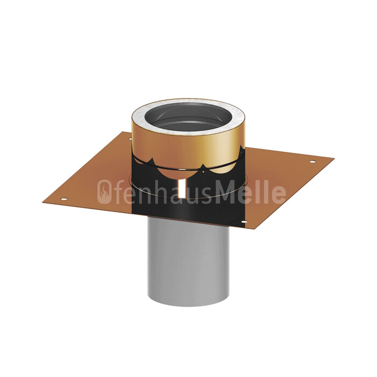 Grundplatte für Kaminerhöhung für doppelwandigen Schornstein aus hochwertigem Edelstahl, mit einer Materialstärke von 0,6 mm und 32 mm Isolierung.