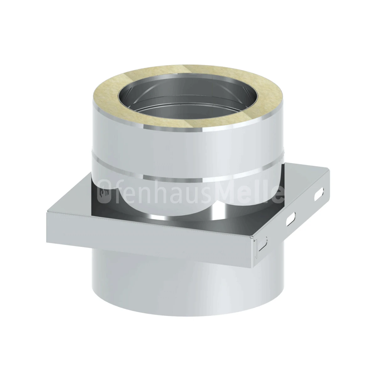 Grundplatte als Zwischenstütze für doppelwandigen Design Schornstein aus hochwertigem Edelstahl, mit einer Materialstärke von 0,6 mm und 32 mm Isolierung.
