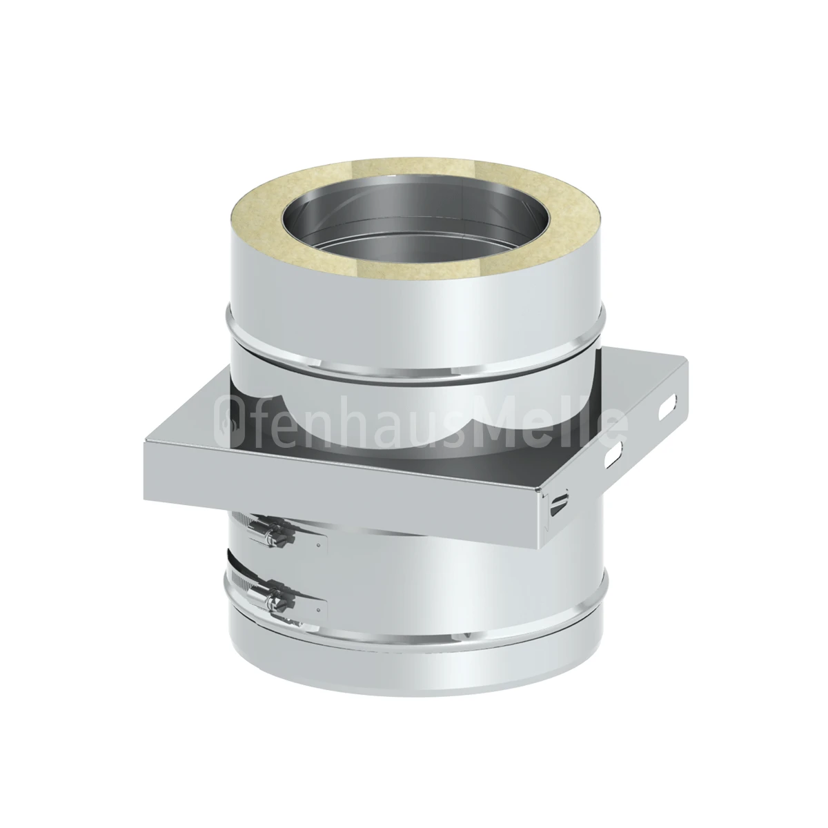 Grundplatte als Zwischenstütze für doppelwandigen Schornstein aus hochwertigem Edelstahl, mit einer Materialstärke von 0,6 mm und 32 mm Isolierung.
