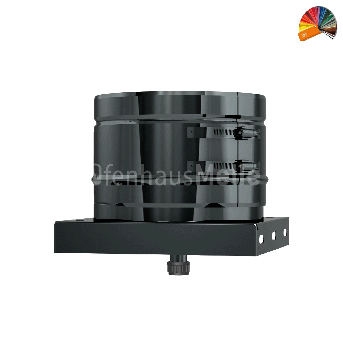 Grundplatte mit Kondensatablauf unten für doppelwandigen, Pulver beschichteten, Schornstein aus hochwertigem Edelstahl, mit einer Materialstärke von 0,6 mm und 32 mm Isolierung.