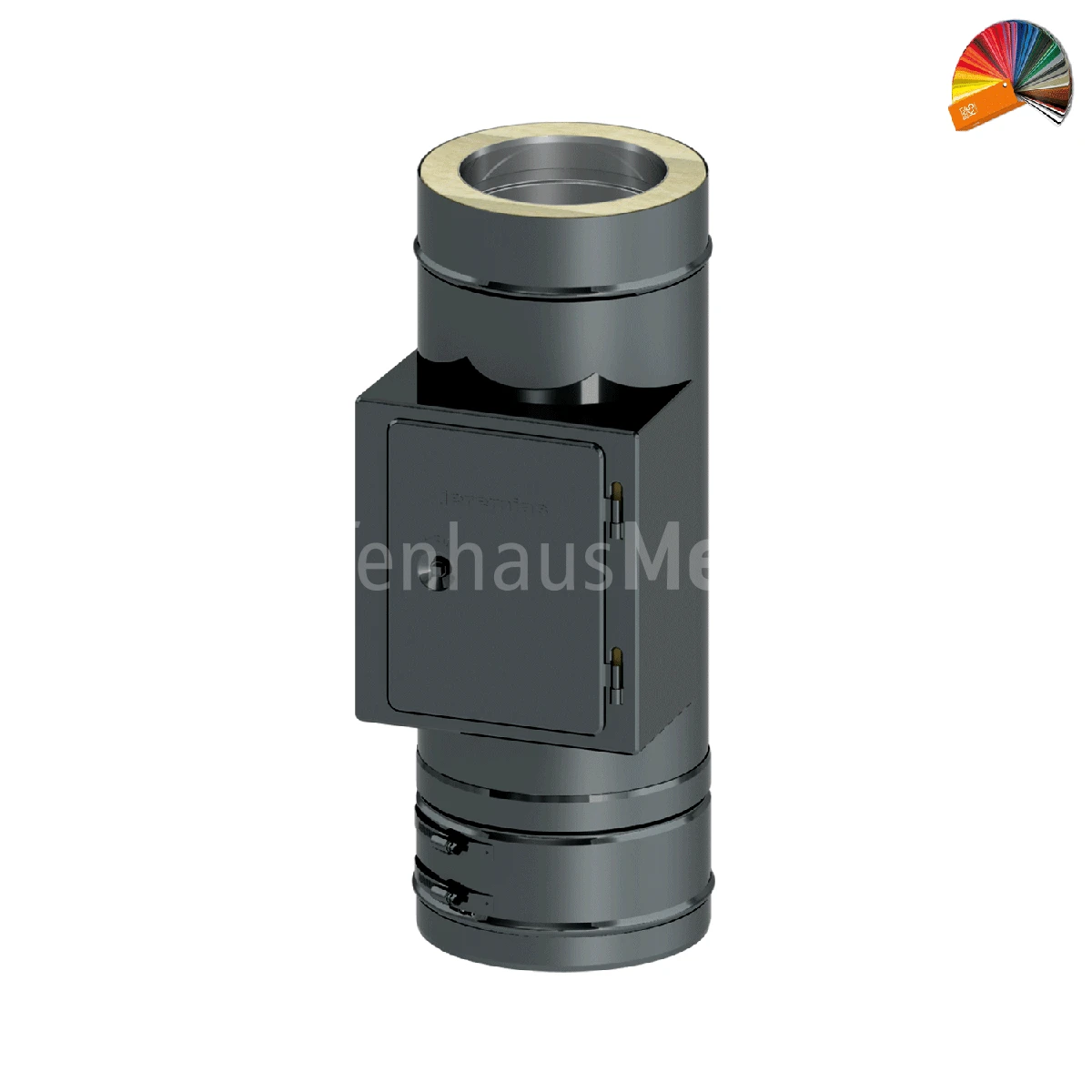 Reinigungselement mit Tür für doppelwandigen Pulver beschichteten Schornstein aus aus hochwertigem Edelstahl, mit einer Materialstärke von 0,6 mm und 32 mm mm Isolierung.