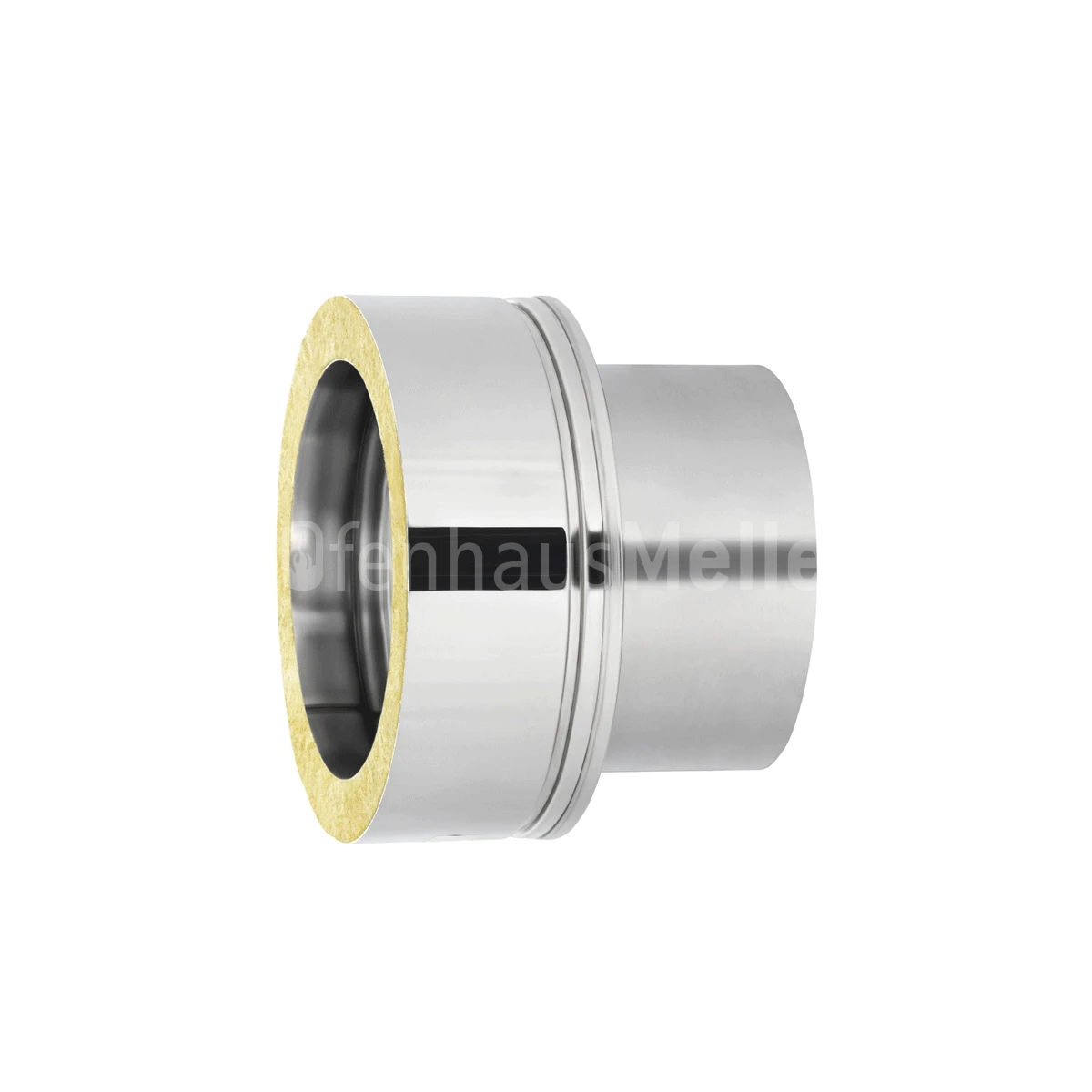 Die Verbindungskupplung dient als Anschluss zwischen doppelwandigem Edelstahlschornstein und DIN Ofenrohr / Rauchrohr mit eingezogener Steckverbindung.