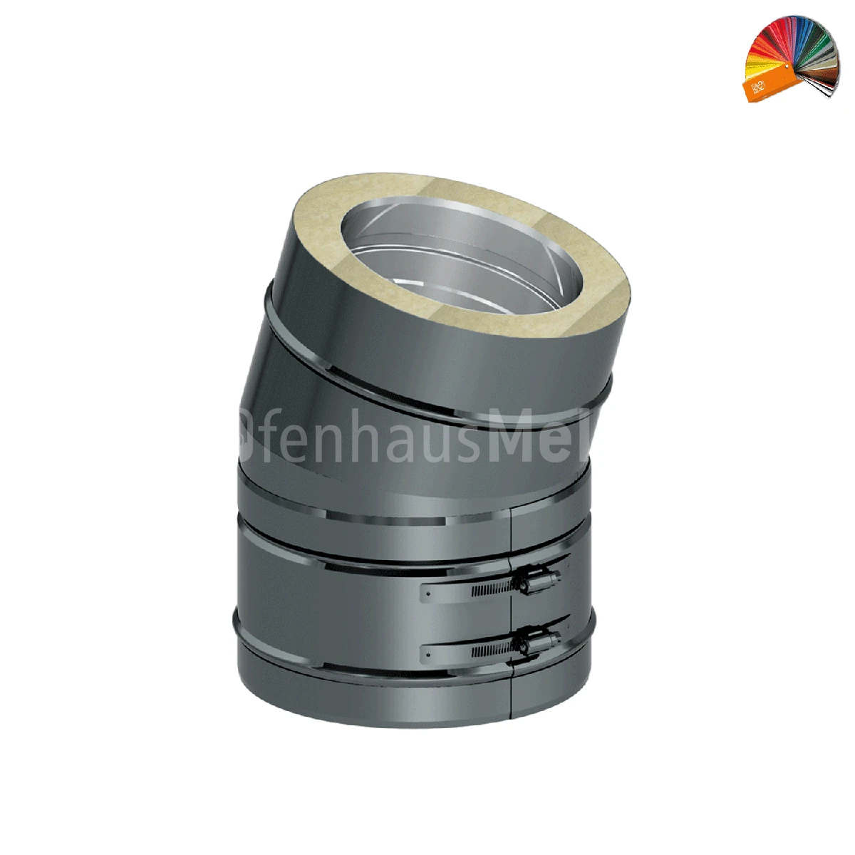 Winkel, Bogen, Segmentbogen 15° für doppelwandigen Pulver beschichteten Schornstein aus hochwertigem Edelstahl, mit einer Materialstärke von 0,6 mm und 32 mm Isolierung.