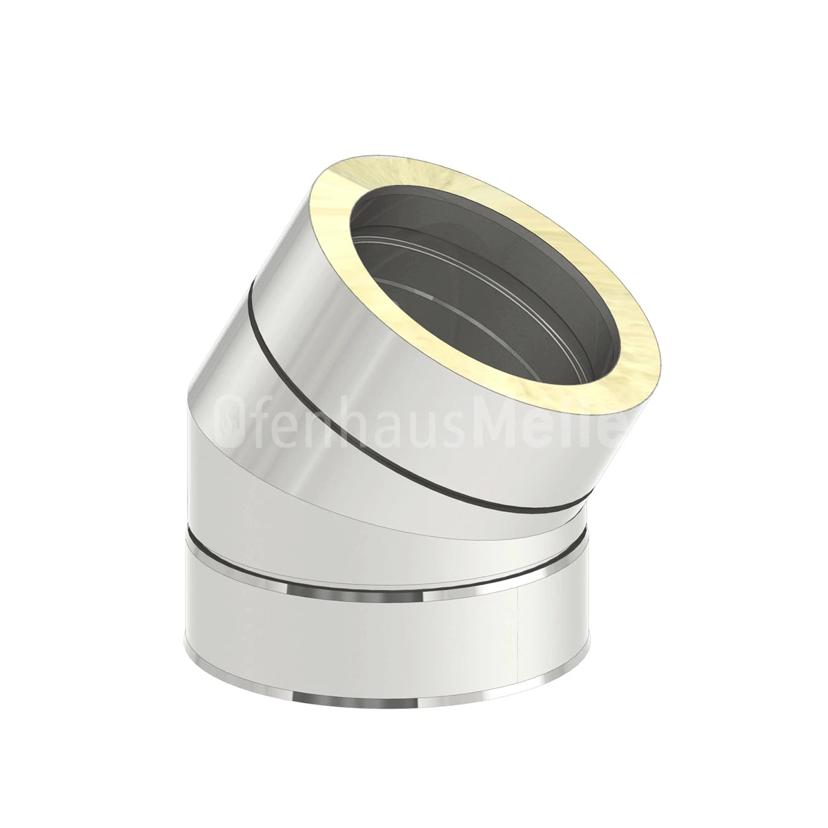 Winkel, Bogen, Segmentbogen 30° für doppelwandigen Schornstein aus hochwertigem Edelstahl, mit einer Materialstärke von 0,5 mm und 25 mm Isolierung.