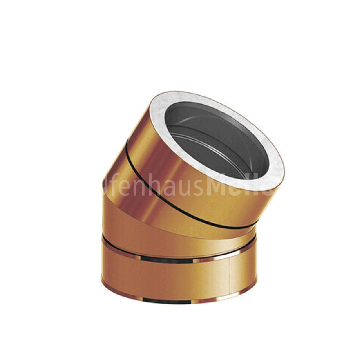 Winkel, Bogen, Segmentbogen 30° für doppelwandigen Schornstein, Innenschale aus hochwertigem Edelstahl, Außenschale aus Kupfer massiv, mit einer Materialstärke von 0,6 mm und 32 mm Isolierung.