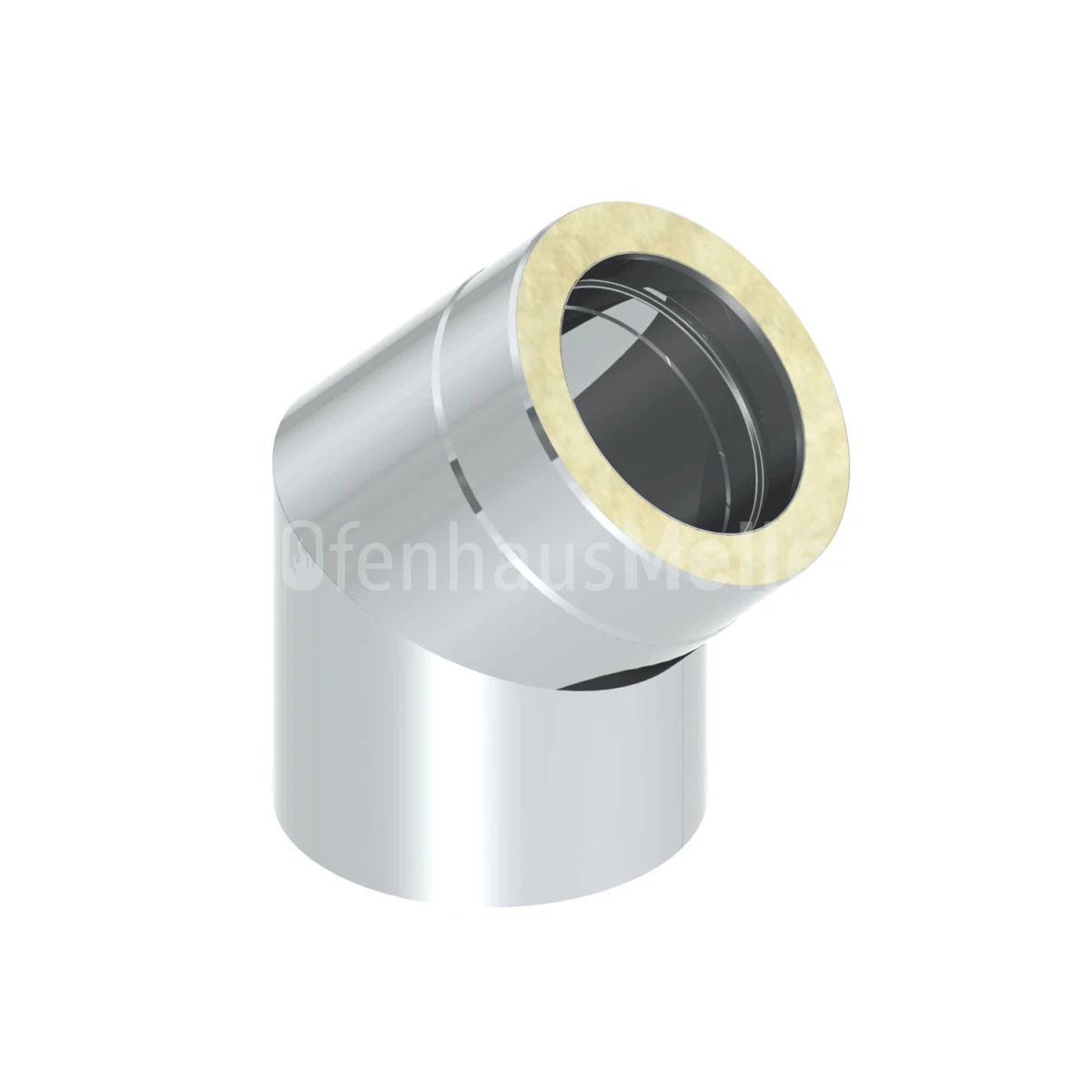 Winkel, Bogen, Segmentbogen 45° für doppelwandigen Design Schornstein aus hochwertigem Edelstahl, mit einer Materialstärke von 0,6 mm und 32 mm Isolierung.