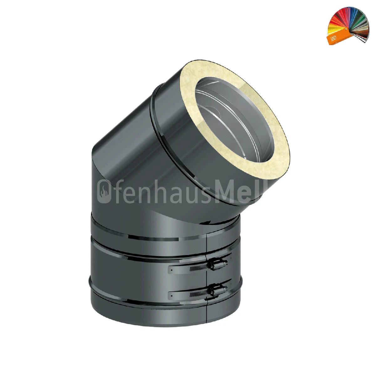 Winkel, Bogen, Segmentbogen 45° für doppelwandigen Pulver beschichteten Schornstein aus hochwertigem Edelstahl, mit einer Materialstärke von 0,6 mm und 32 mm Isolierung.