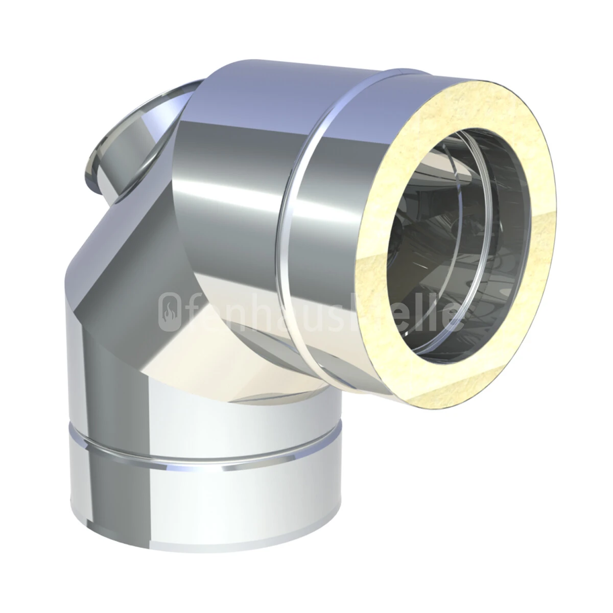 Winkel, Bogen, Segmentbogen 90° mit Reinigungsdeckel für Festbrennstoffe (auch Außenbereich) für doppelwandigen Schornstein aus hochwertigem Edelstahl, mit einer Materialstärke von 0,6 mm und 32 mm Isolierung.