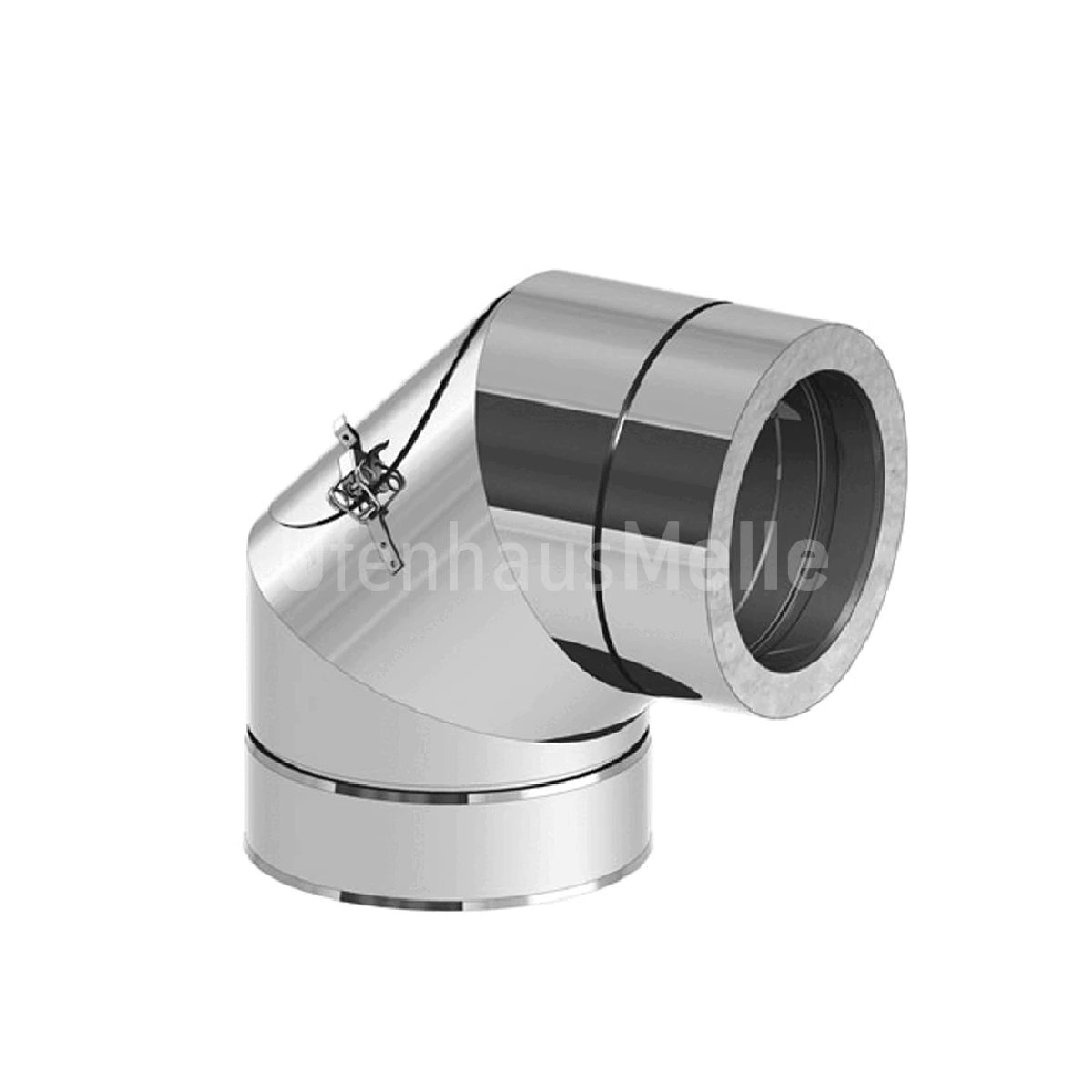 Winkel, Bogen, Segmentbogen 90° mit Reinigungsdeckel für doppelwandigen Schornstein aus hochwertigem Edelstahl, mit einer Materialstärke von 0,6 mm und 32 mm Isolierung.